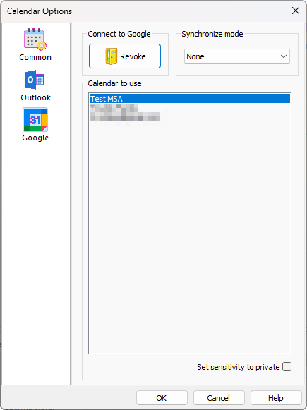(See the dedicated help topic for more details about the authentication process.) - Once connected, a list of available calendars will appear.