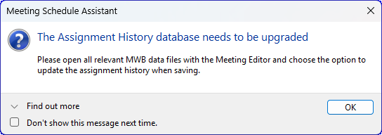 If you navigate to a week where the Assignment History database has not yet been upgraded, a message will appear informing you that an update is required. This ensures that features such as Meeting Attendance work correctly and that all assignment data is stored in the latest format.