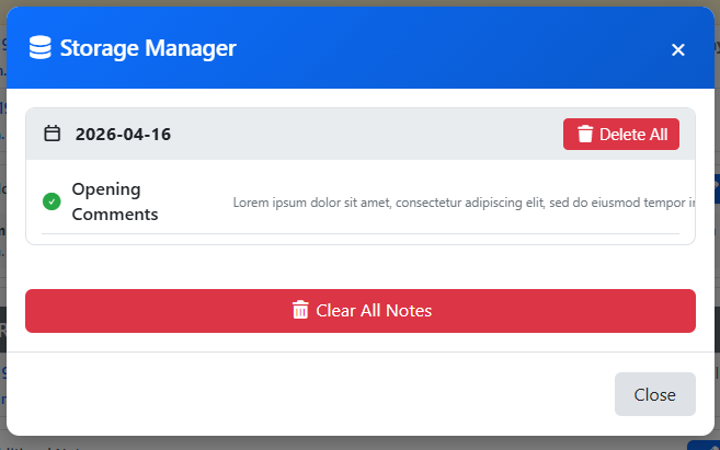 The Storage Manager lets you view, manage, and delete all your saved notes across different meeting dates. Everything is stored locally in your browser—nothing is uploaded or shared.