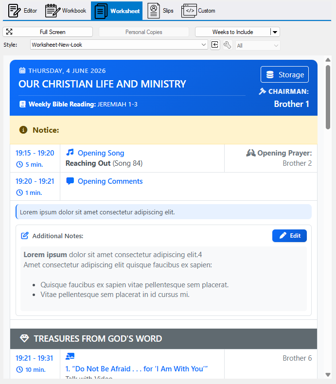 A new This Week button has been added to the Meeting Editor, making it easy to return to the current week at any time. If you’ve been browsing ahead or reviewing past weeks, you can now jump back instantly with a single click — the button appears whenever the current week is available.
