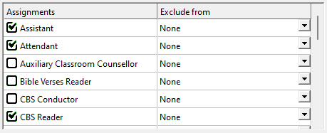 Note that there are both Assistant and Student assignments (Bible Reading / Discussion / Talk)! Also, that default exclusions are only applied when creating new schedules. You need to also be aware that they are only applied to the active schedule type (for most users, this will be the default schedule type).