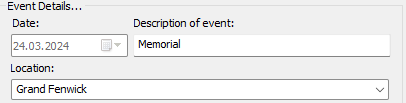 Each time you select an event in the list, the date, description and location get revised. Note that the date is always disabled. So if you want to change the event date, you must delete the existing event and add the revised event with the modified date.