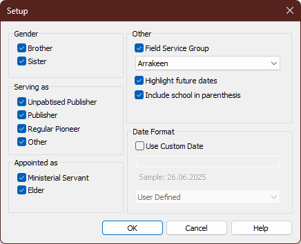 This dialog allows you to configure how the Publisher - Full History (Midweek Meeting) report is generated. The options you select determine which publishers are included and how information is displayed.