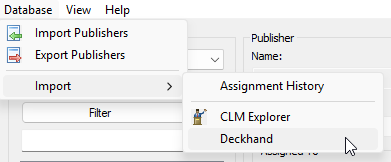 In the Publishers Database window, select Deckhand from the Import fly-out menu on the Database menu.