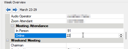 You can update the Meeting Attendance for each meeting directly from the Week Overview panel. This allows you to keep attendance records current without using the Meeting Attendance manager.
