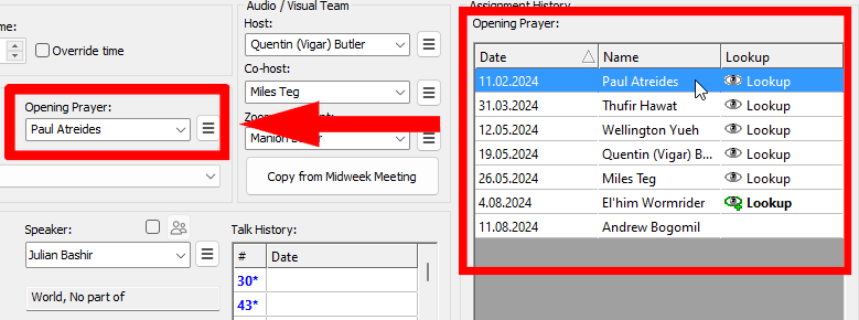 Things work differently for the Away Speaker assignment. It will display the history but clicking on a name in the history will not update the assignment. Changes to away talks need to be done by using the Add / Edit / Delete buttons provided (or double-clicking the away talk assignment).