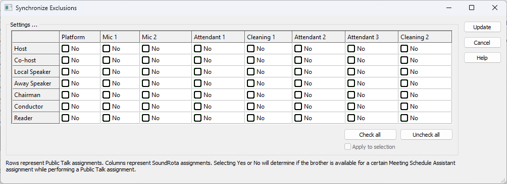 What you do is isolate which Public Talk assignments should be excluded. Do this by clicking on the relationship in question and it will toggle on or off accordingly. Once you are happy with your relationship settings you should click Update and the program will revise the brother exclusions by looking at the Public Talks database. You should then see the changes reflected in the Brother Exclusions dialogue automatically.